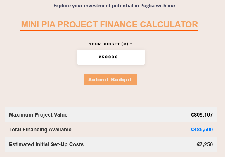 Our Mini PIA Project Calculator is a free, online tool built specifically for investors interested in Puglia real estate. By entering your budget, the calculator generates an estimated maximum project value and provides insights into potential non-refundable grants and tax credits available under Puglia’s Mini PIA (Programmi Integrati di Agevolazione) funding scheme. The Mini PIA program supports small and medium-sized enterprises (SMEs) with grants aimed at expanding tourism infrastructure and encouraging regional economic growth.